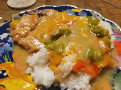 Cook your white rice to package directions and then add rice to your plate and cover with a pork chop and creamy sauced vegetable and enjoy!